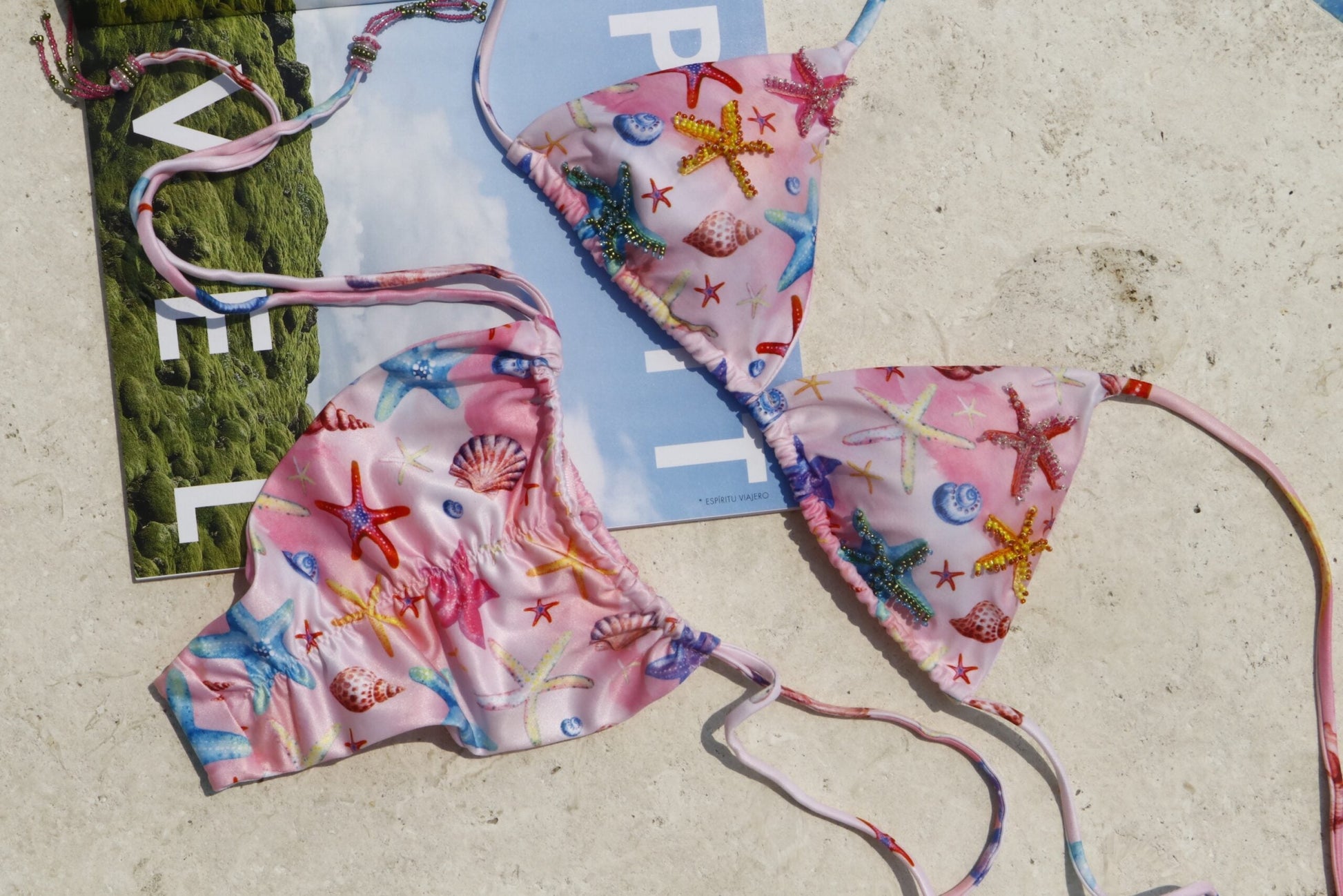 Top con amarre en abdomen. Panty corredizo y bordado a mano.