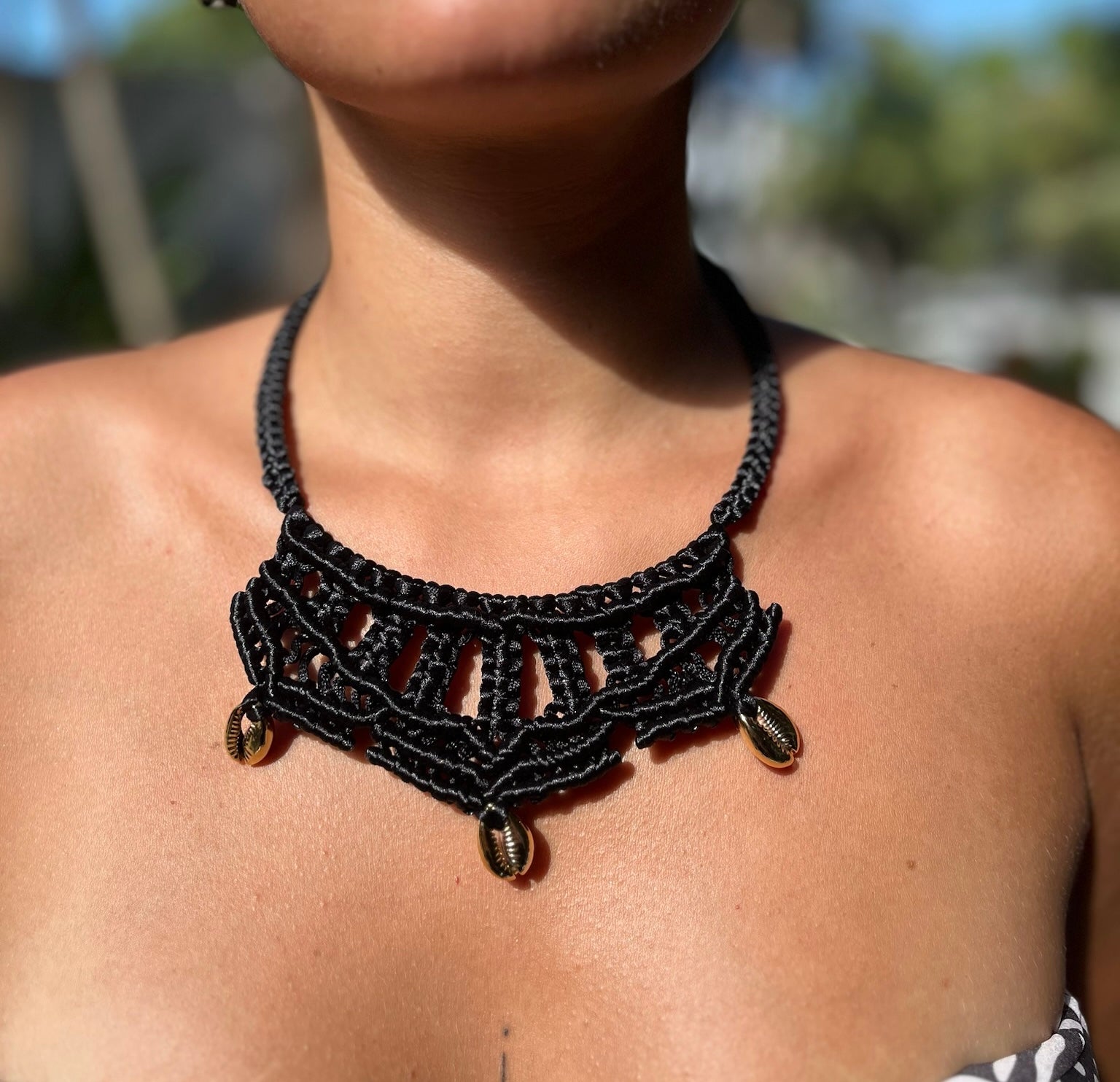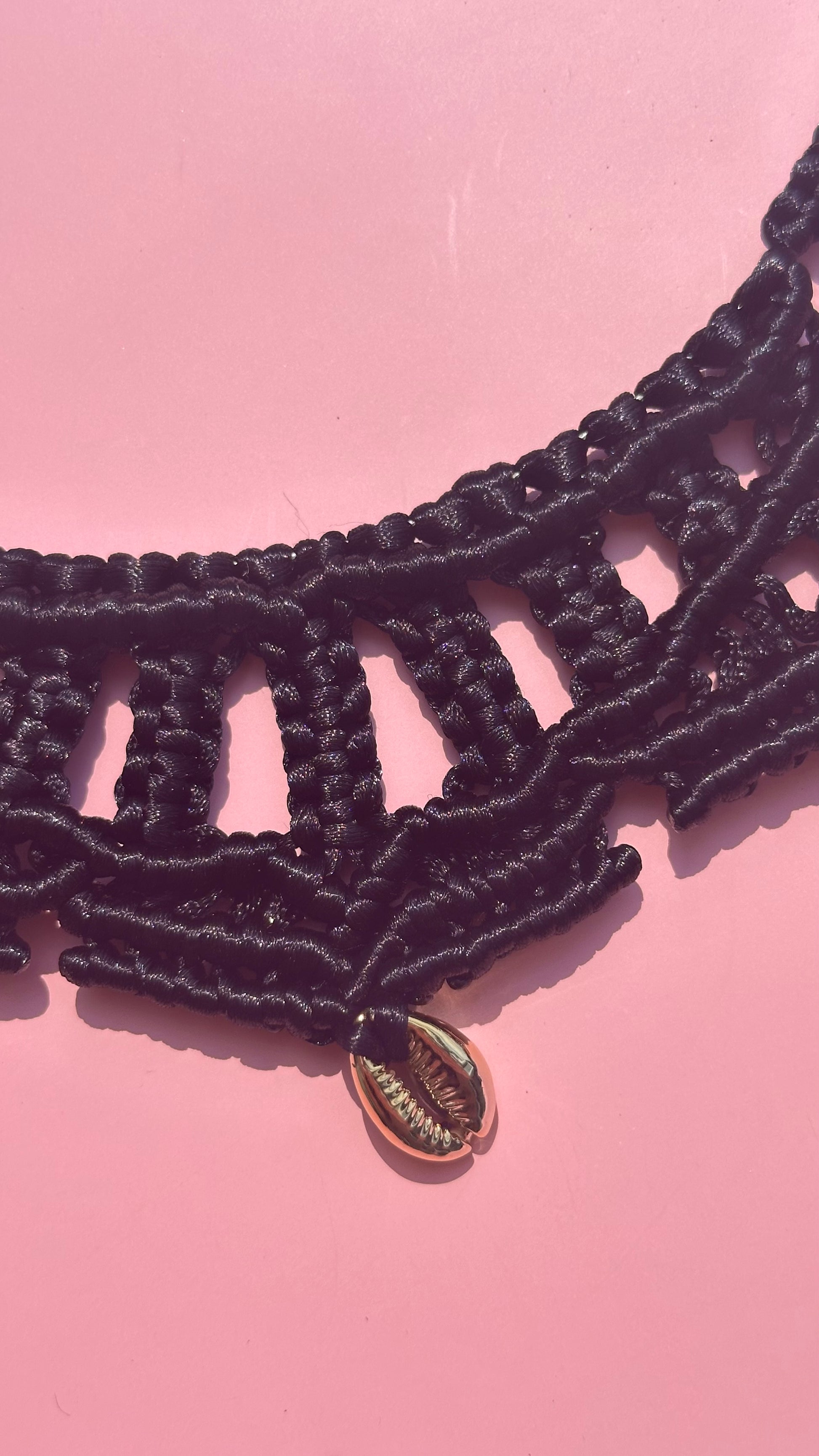 Collar tejido a mano, con broche y caracoles dorados en decoración. Combínalo con tu mejor outfit !!!