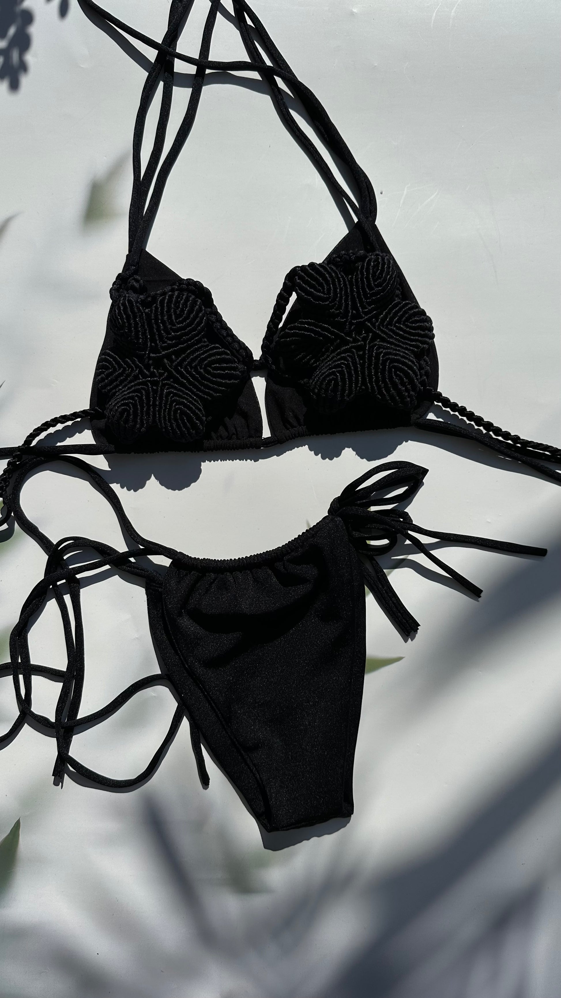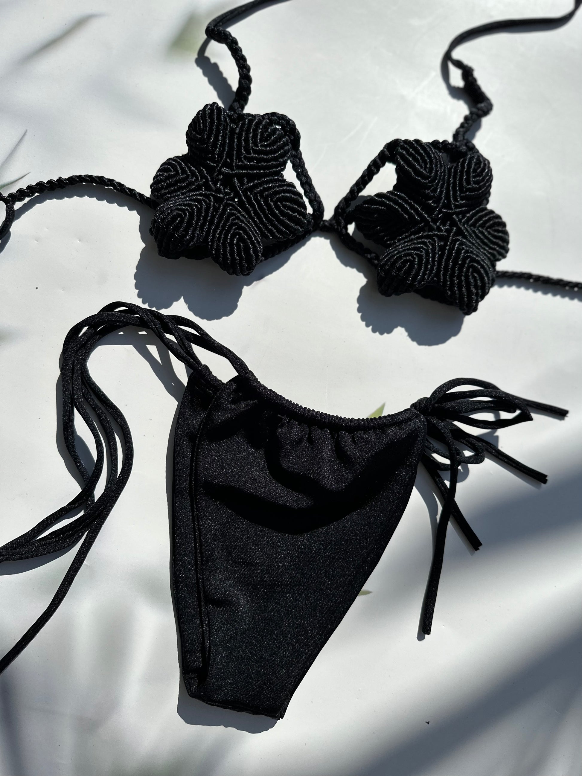 Florecita negra, con forro de mesh para quien quiera usarlo y sentirse mas cómoda, panty de amarrar de los lados. Talla corren bien.