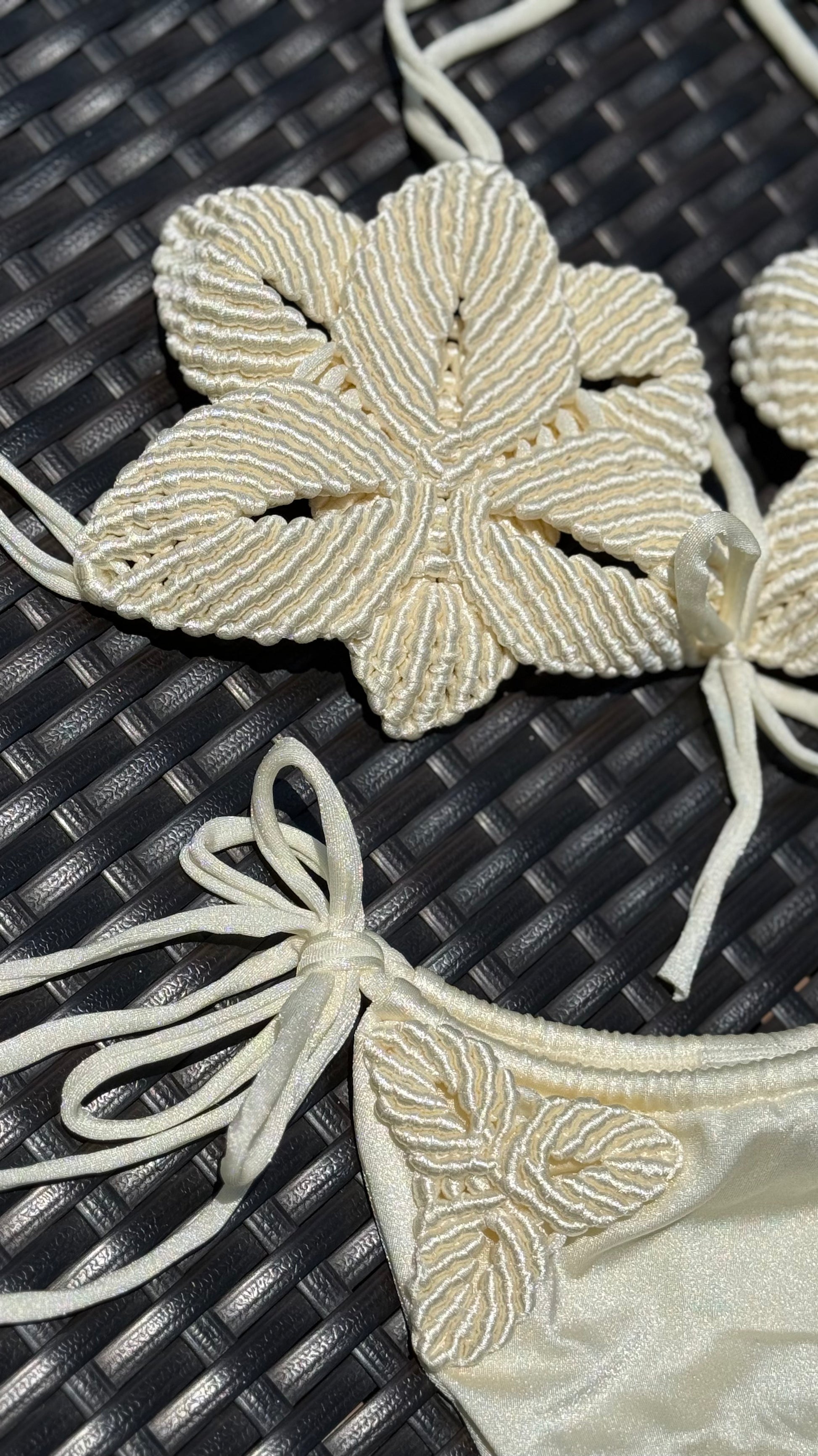 Bikini artesanal tejido, con tiras de amarrar en el panty, ajuste enmedio del top.