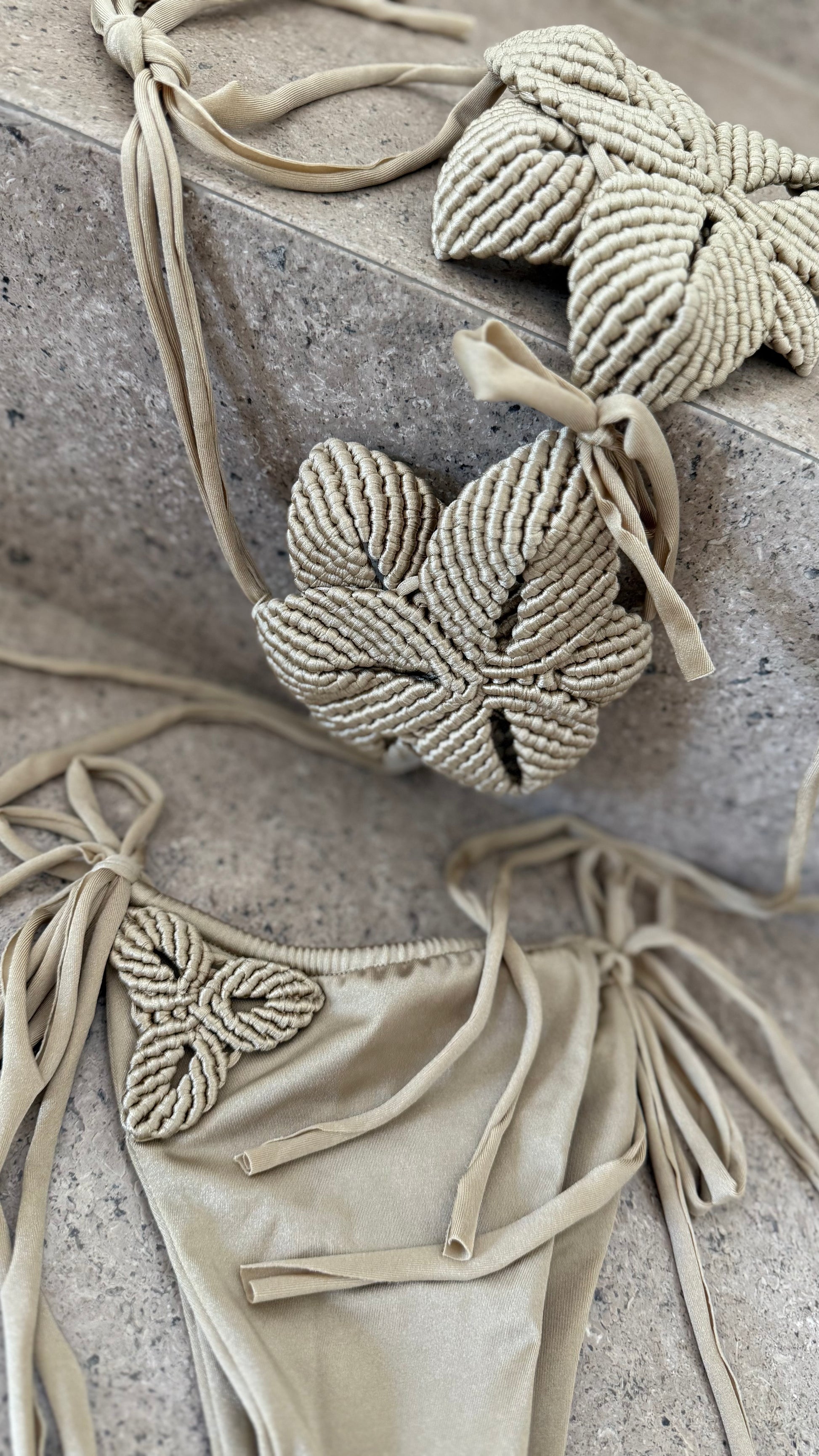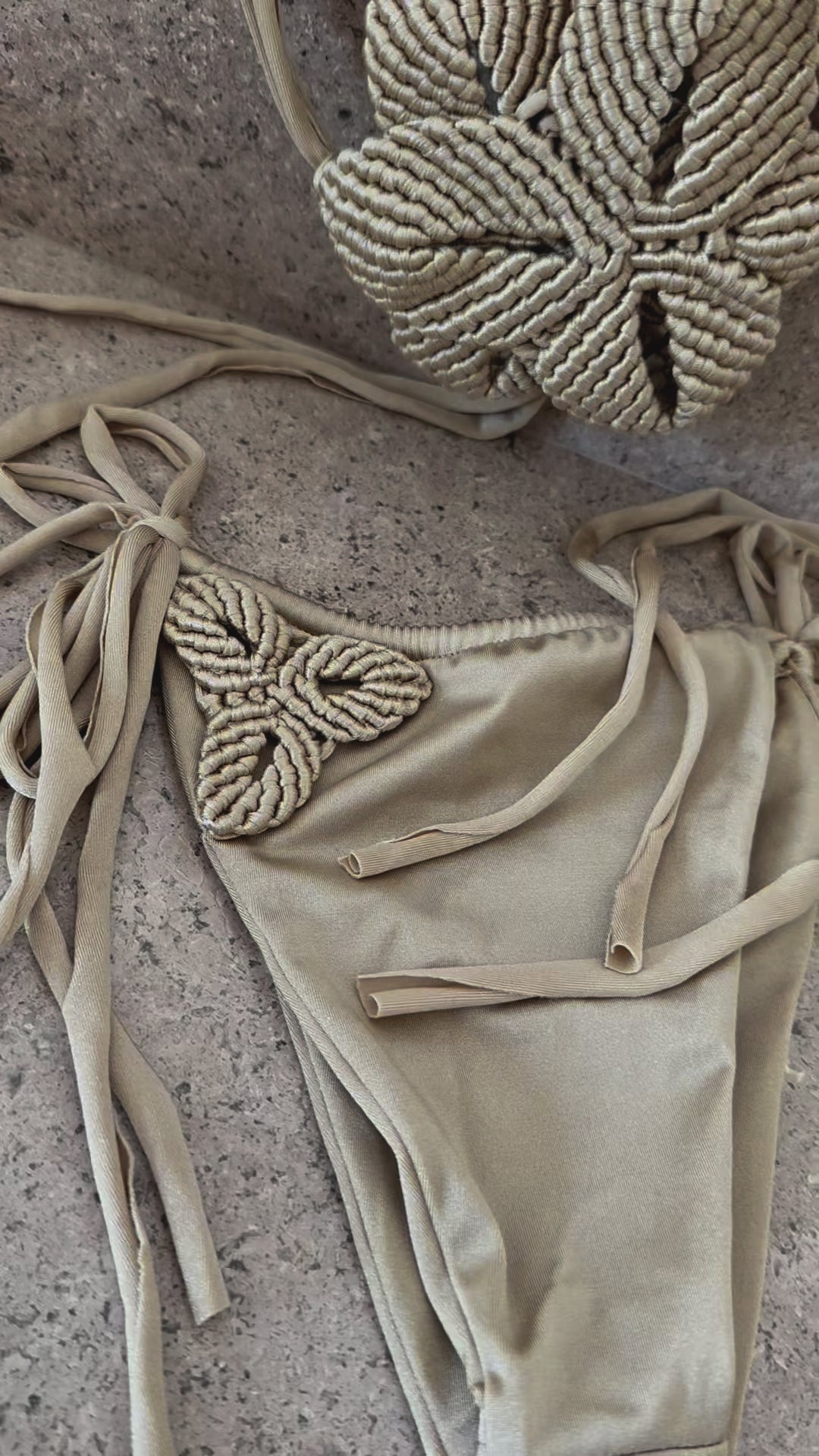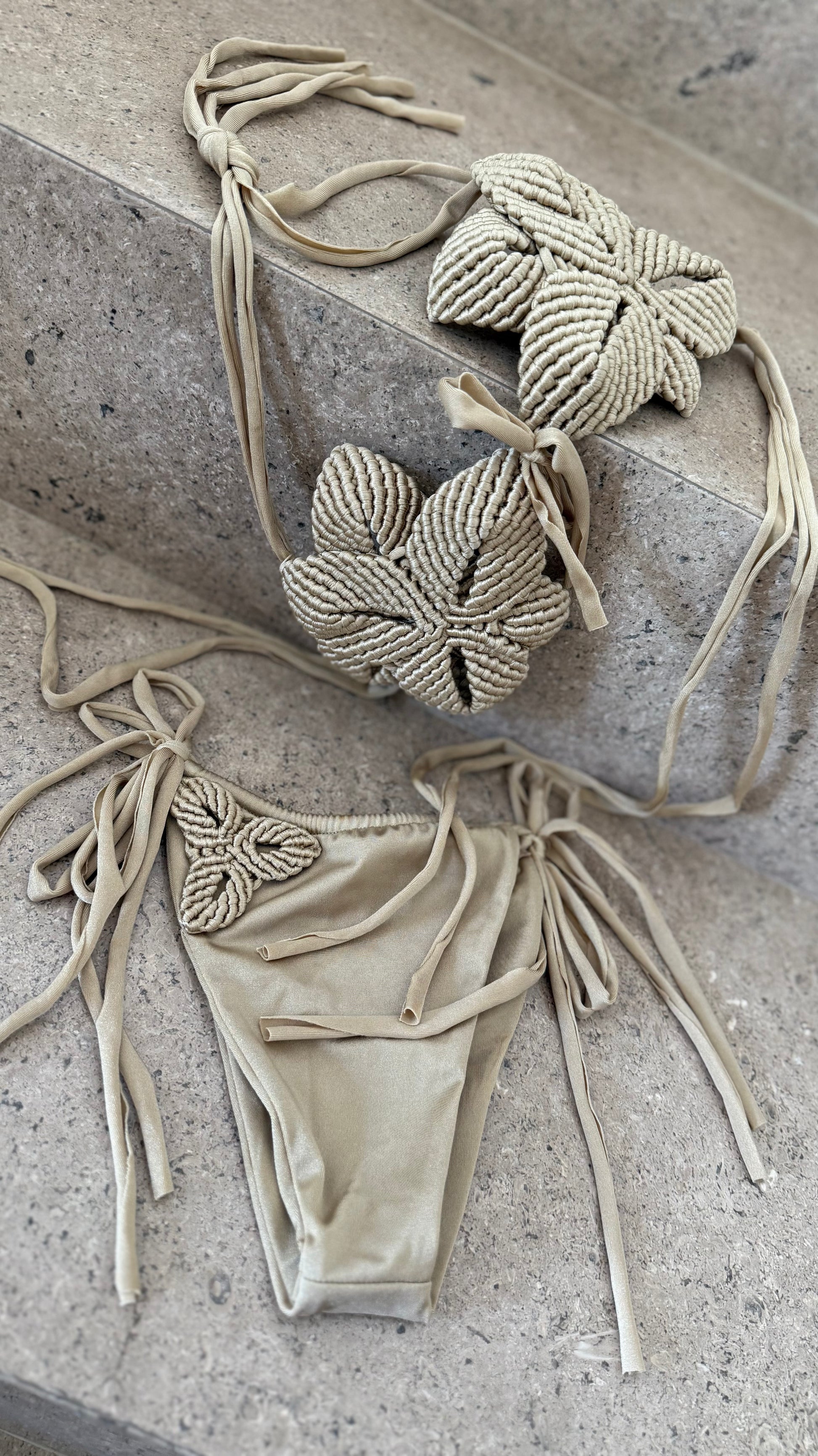 Bikini artesanal tejido, con tiras de amarrar en el panty, ajuste enmedio del top.