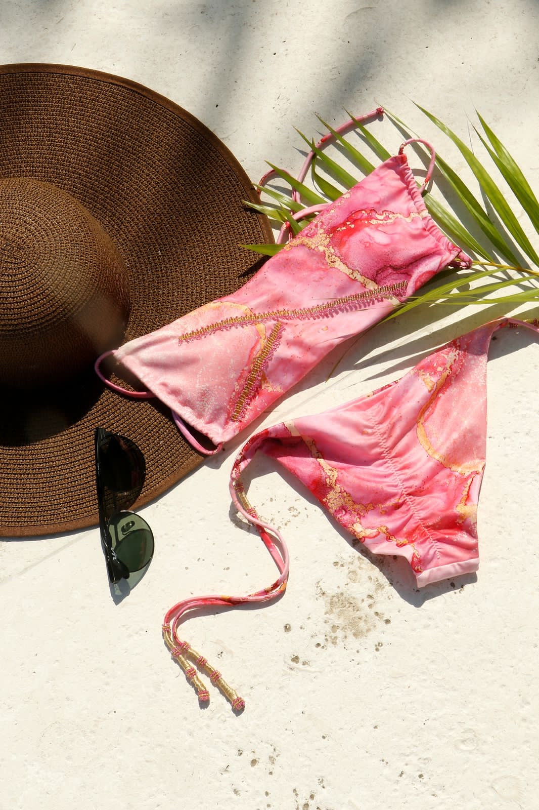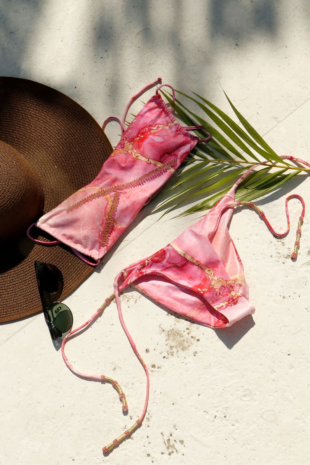 Top corrido con amarre en espalda ajustable. Panty corte clásico, de amarrar y bordado en pedrería a mano.