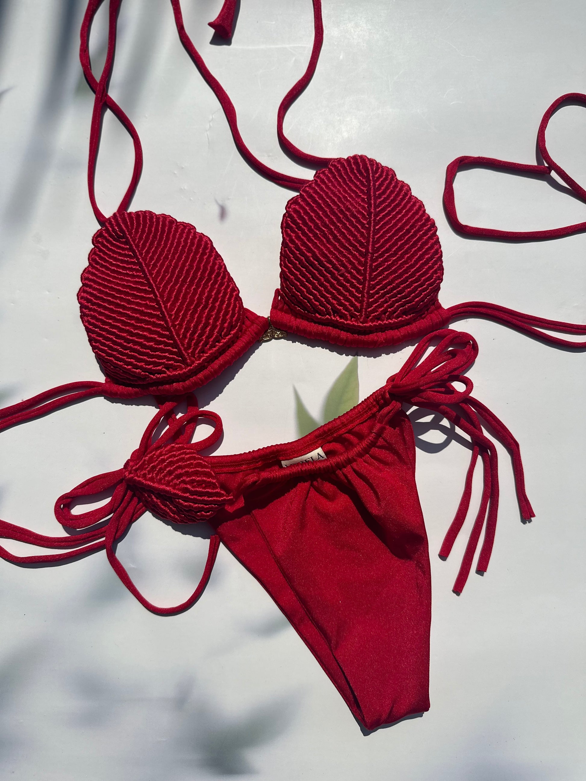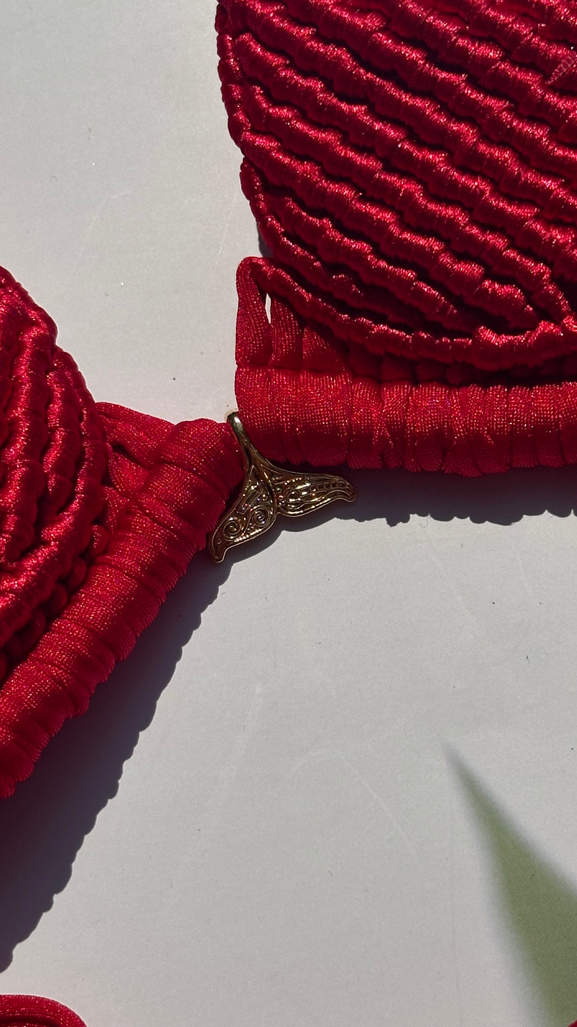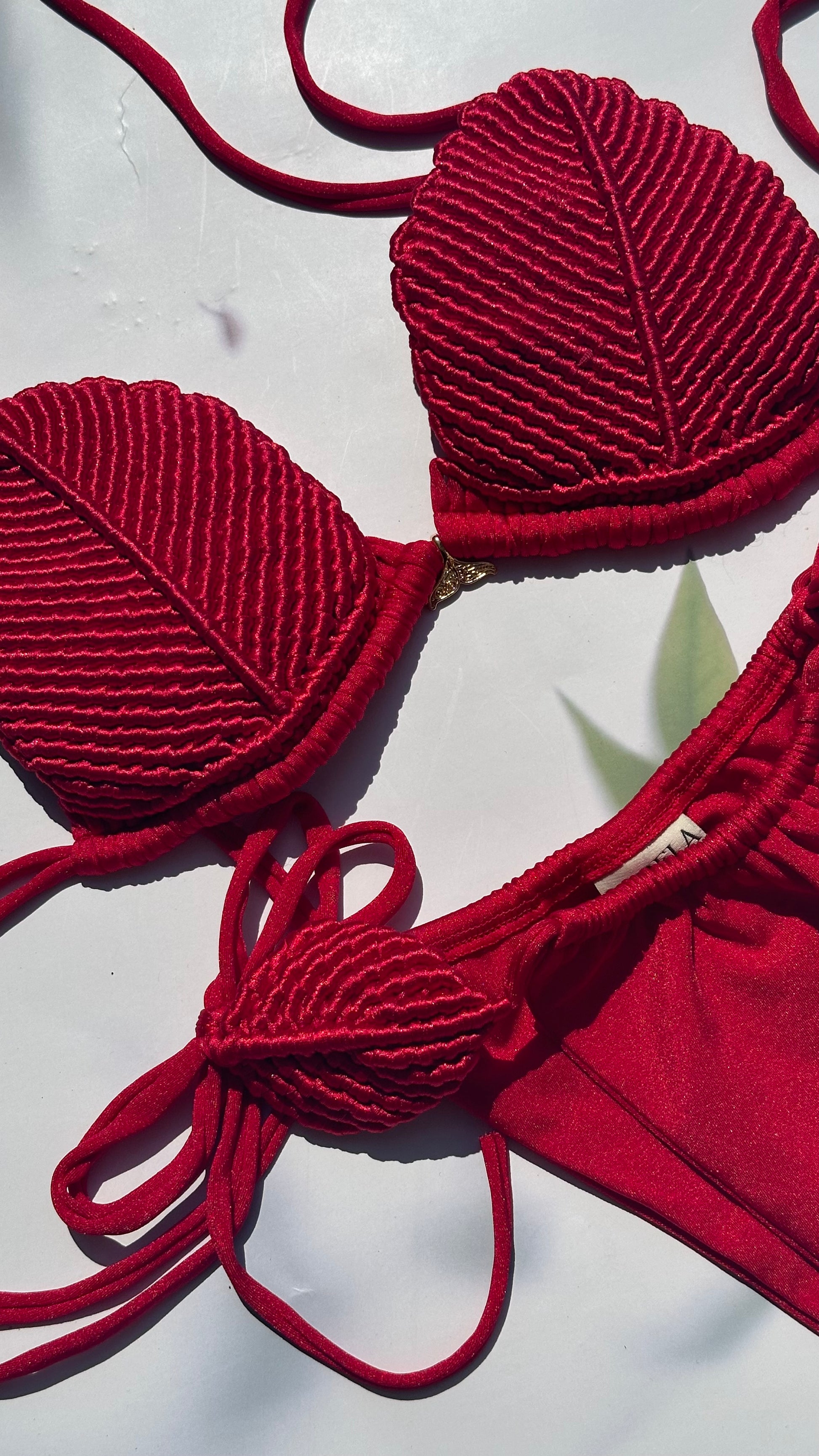 En su color rojo vibrante llega “Passion Red” shell, el rojo vino para quedarse! Tejido a mano con detalle de cola de sirena de nuestro logo por enmedio de las copas. Panty ajustable y de amarrar.