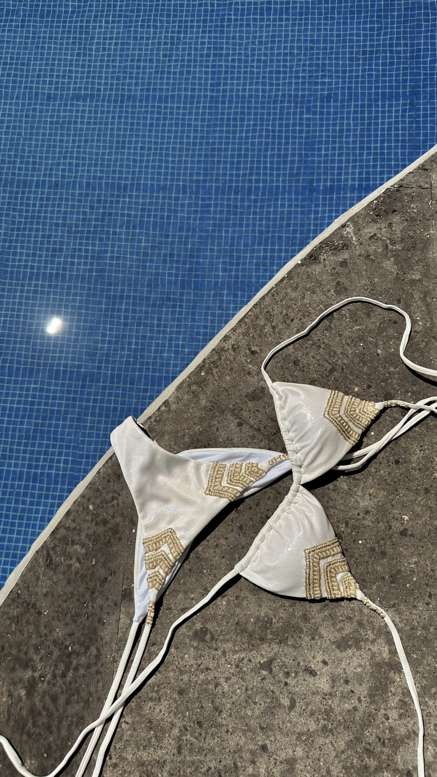 Bikini con tela tornasol, tela delicada, lavar con jabón neutro a mano y sin tallar.