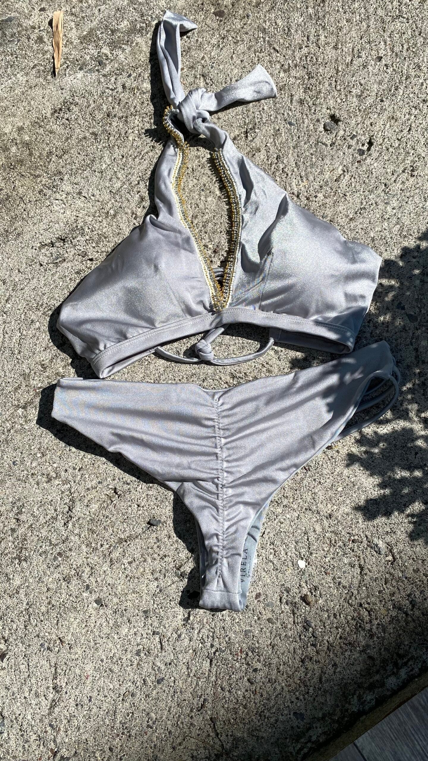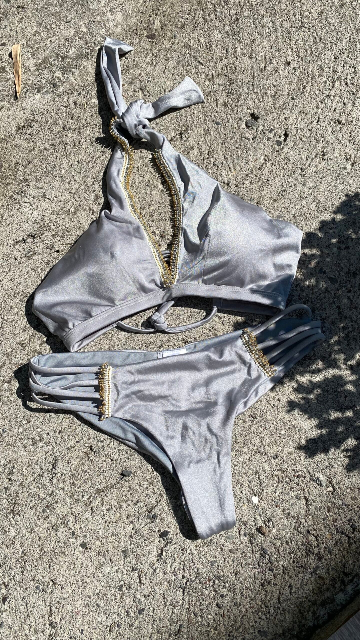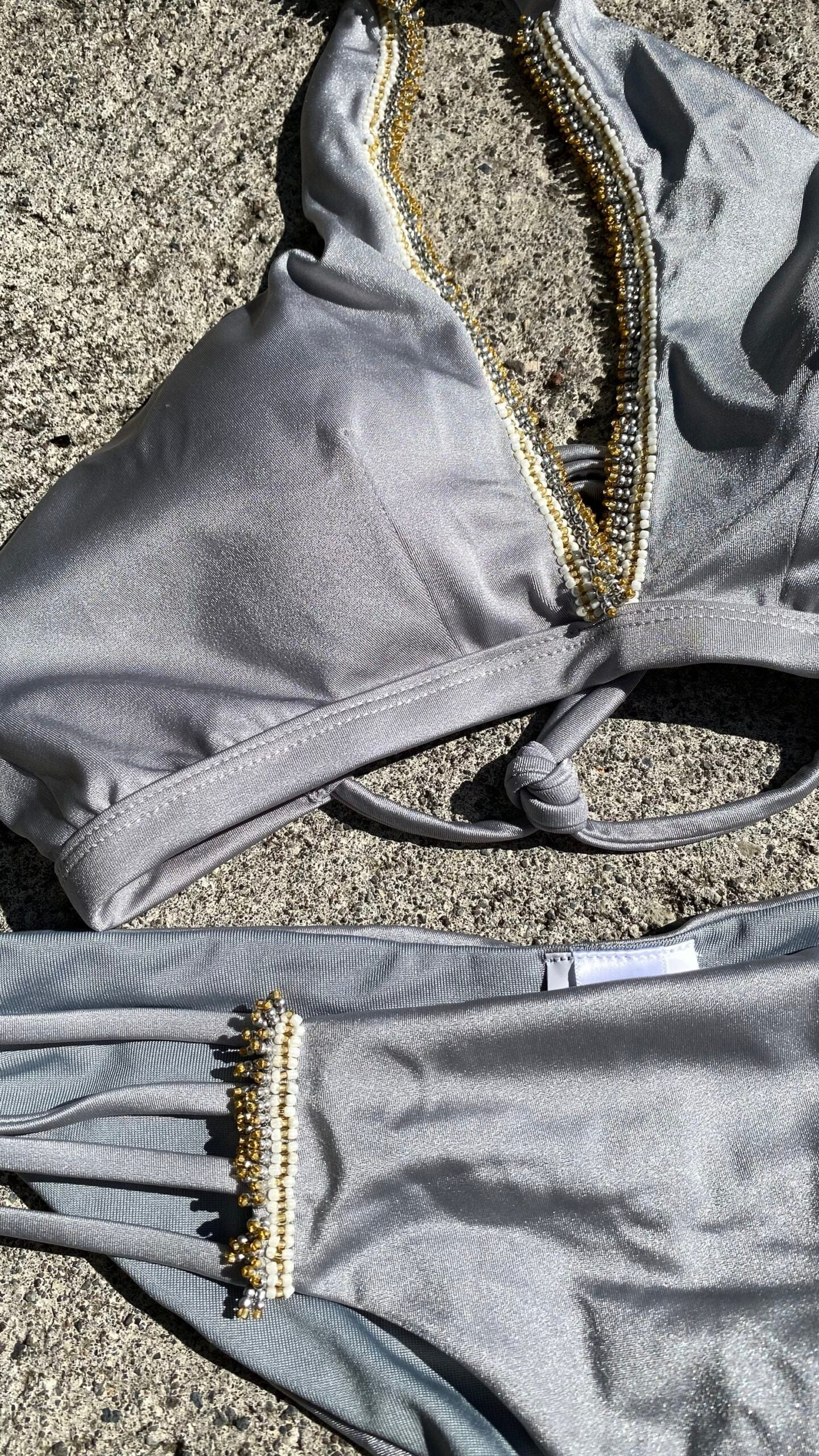Top con escote en pecho, bordado con pedrería a mano, panty sin ajustar. Corte semibrasileño. Tela brillosa