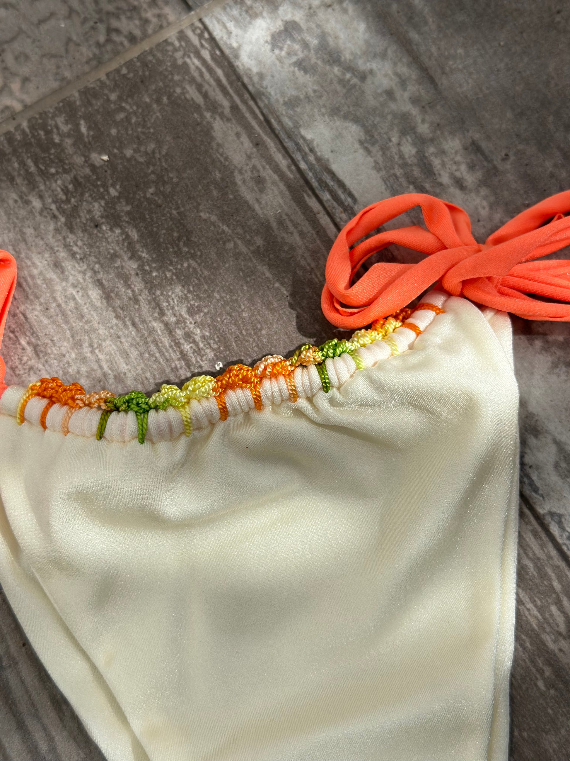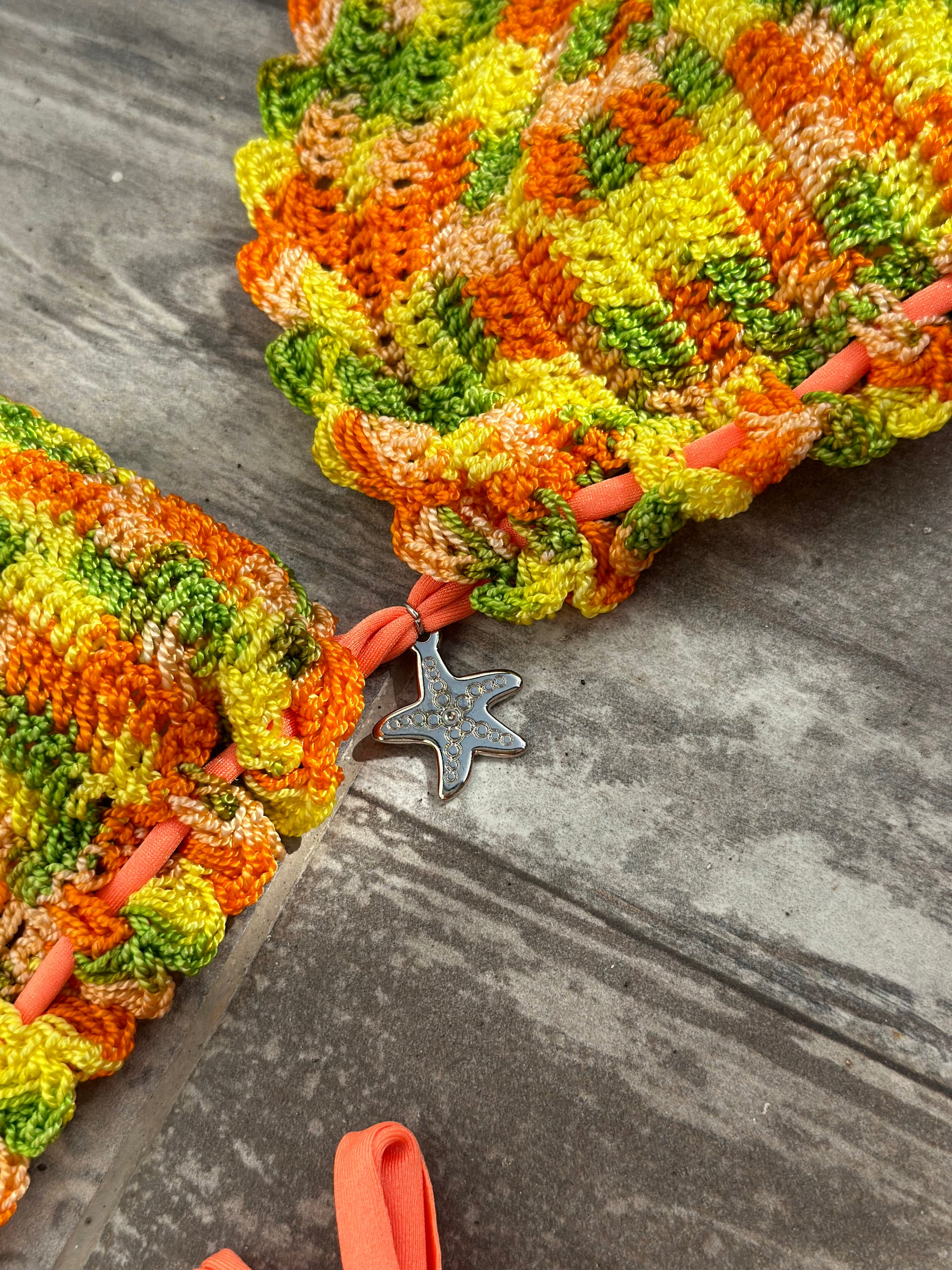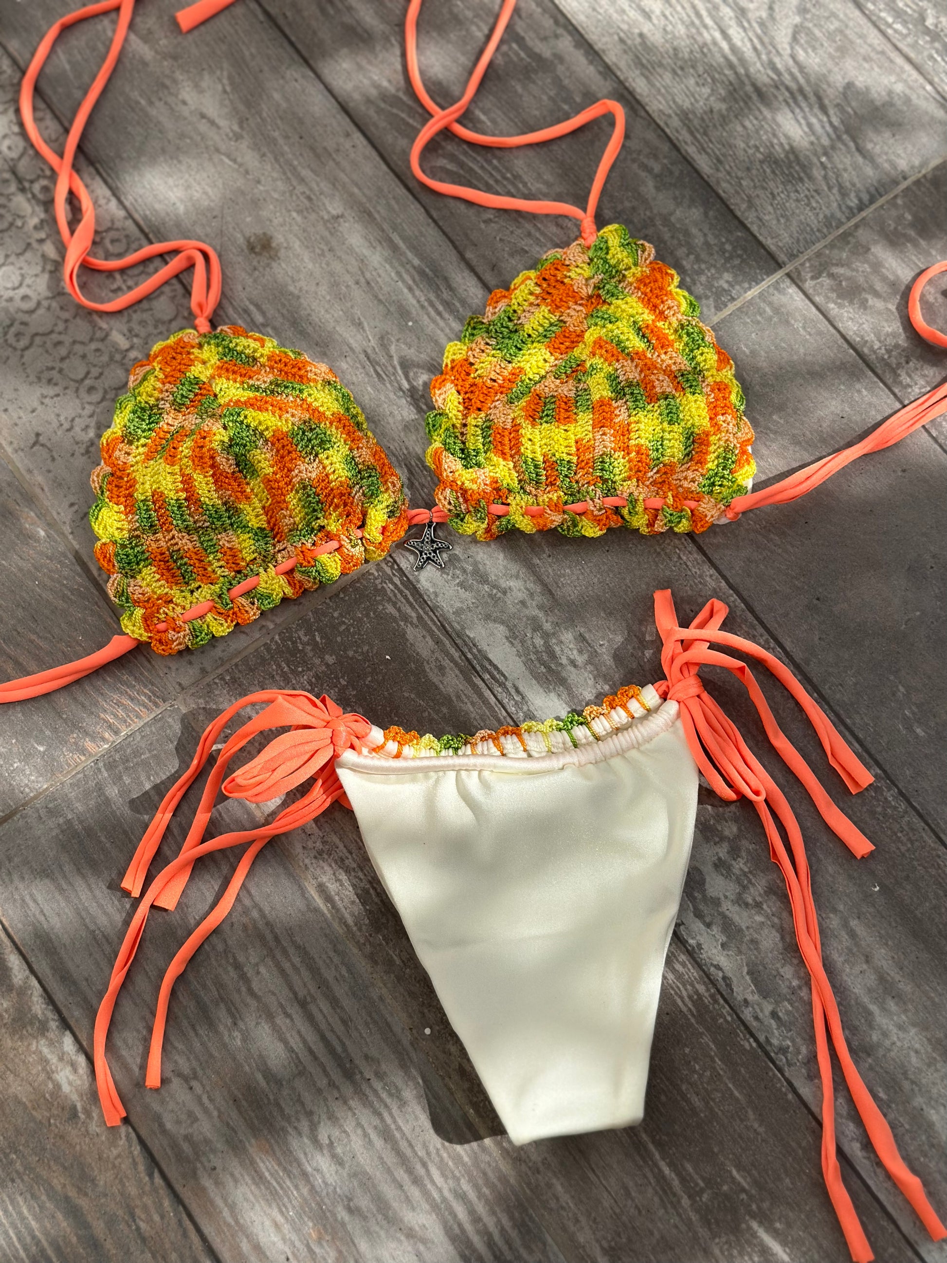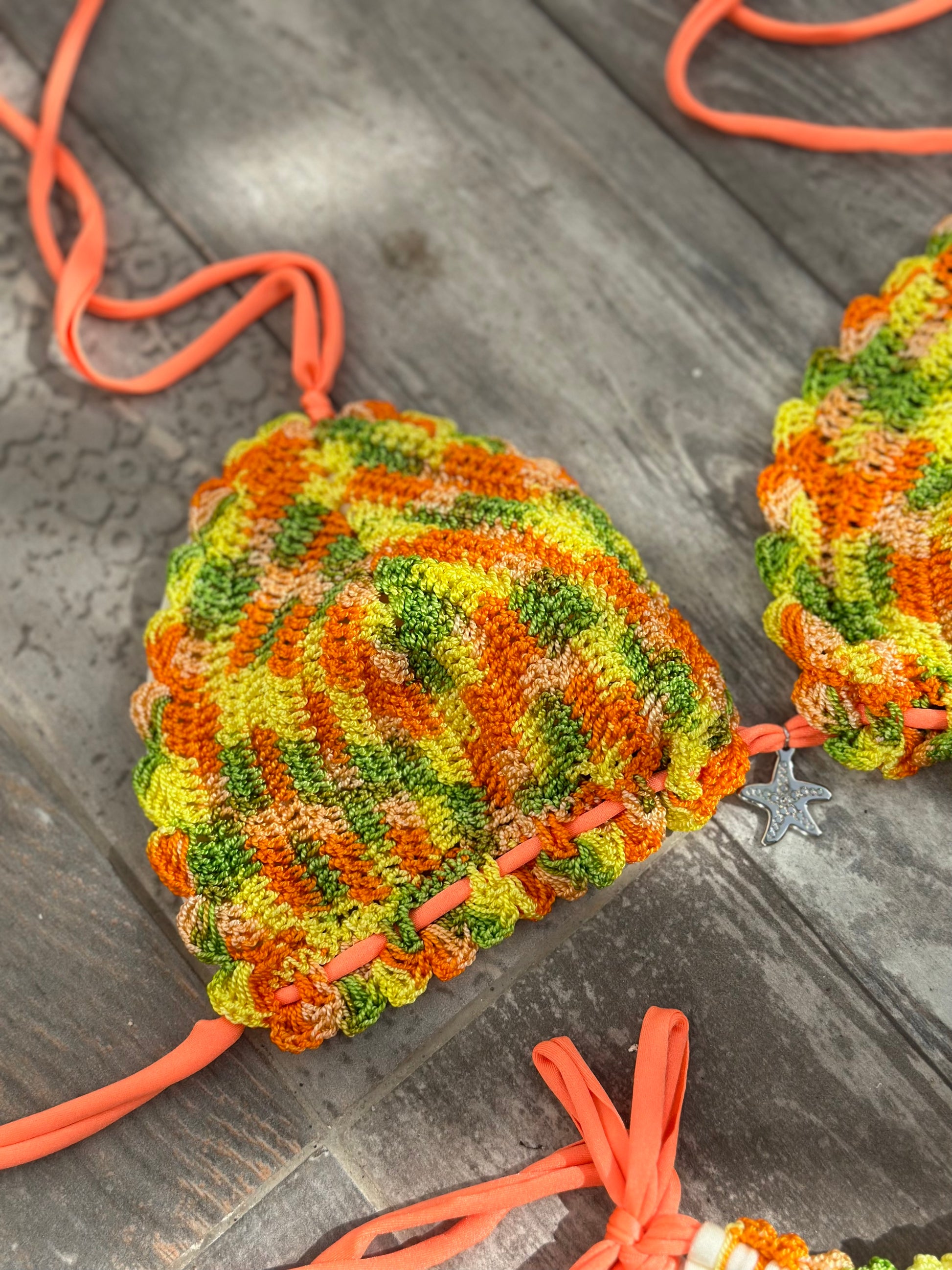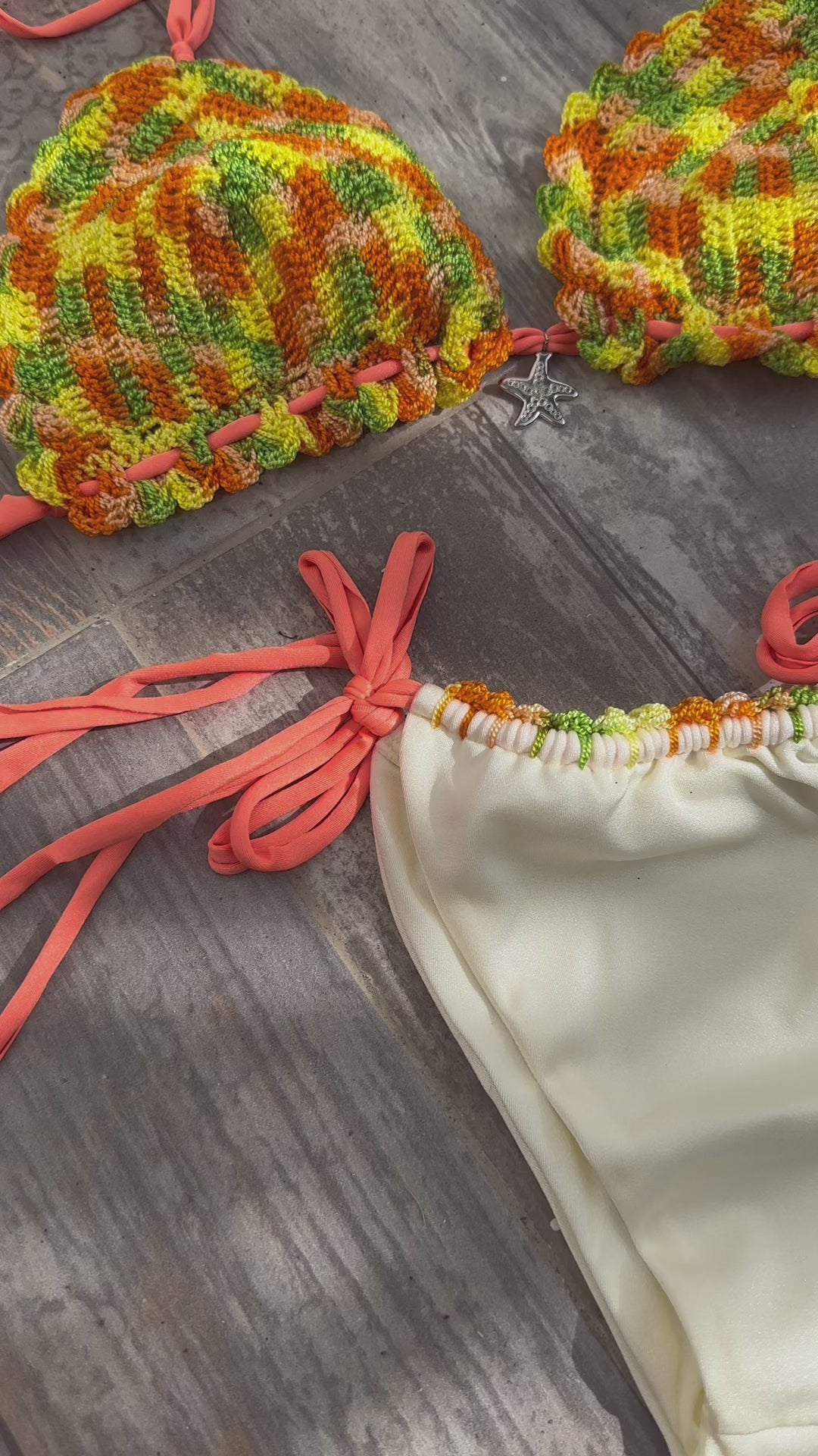MODELO USA TALLA M. COLECCIÓN “DEL MAR”. Tejido en técnica crochet. 100% artrsanal, el top incluye forro, se lo puedes quitar. Panty corredizo ajustable bordado en crochet. Colores de impacto, que te harán lucir mas bronceada.