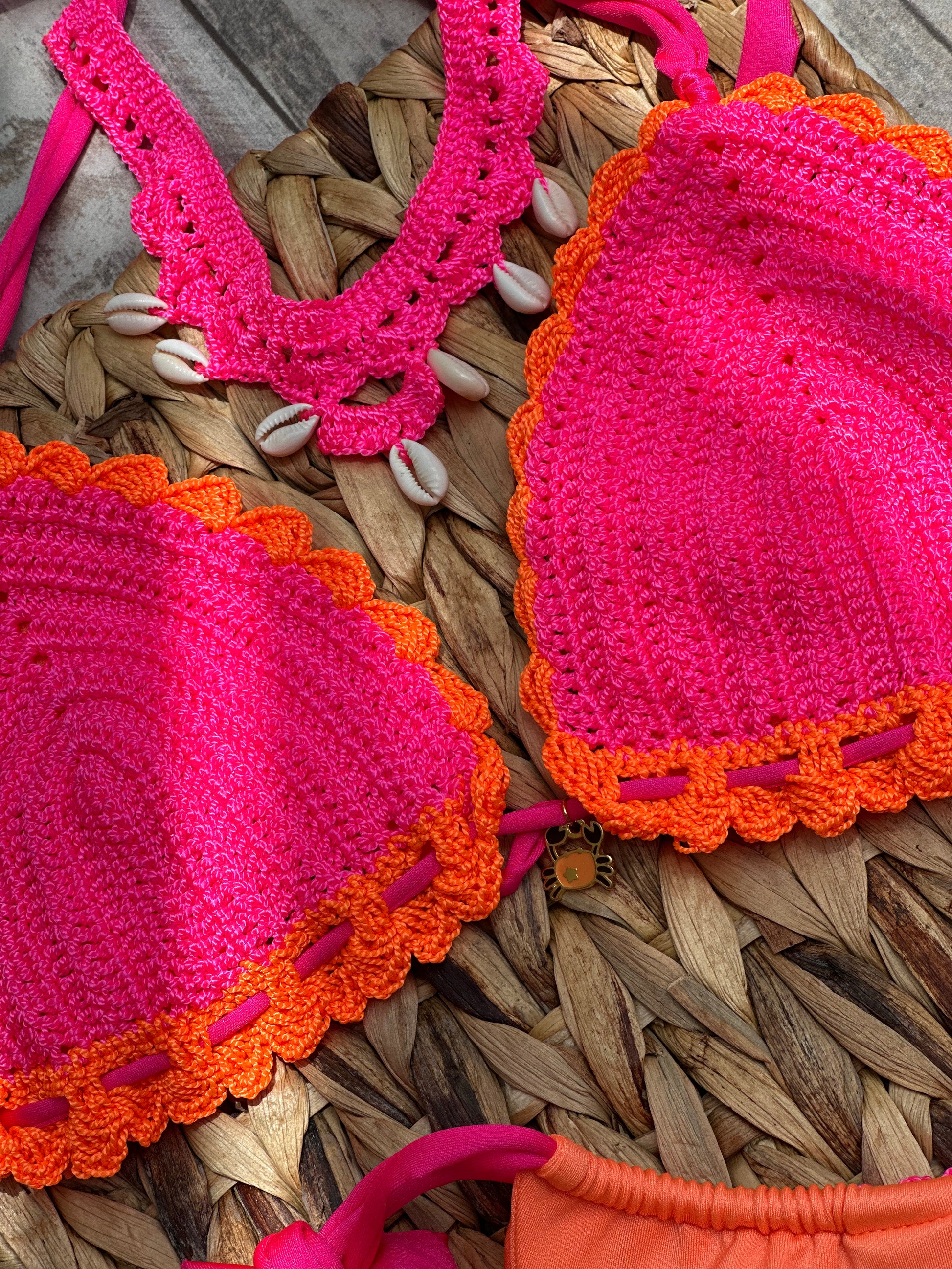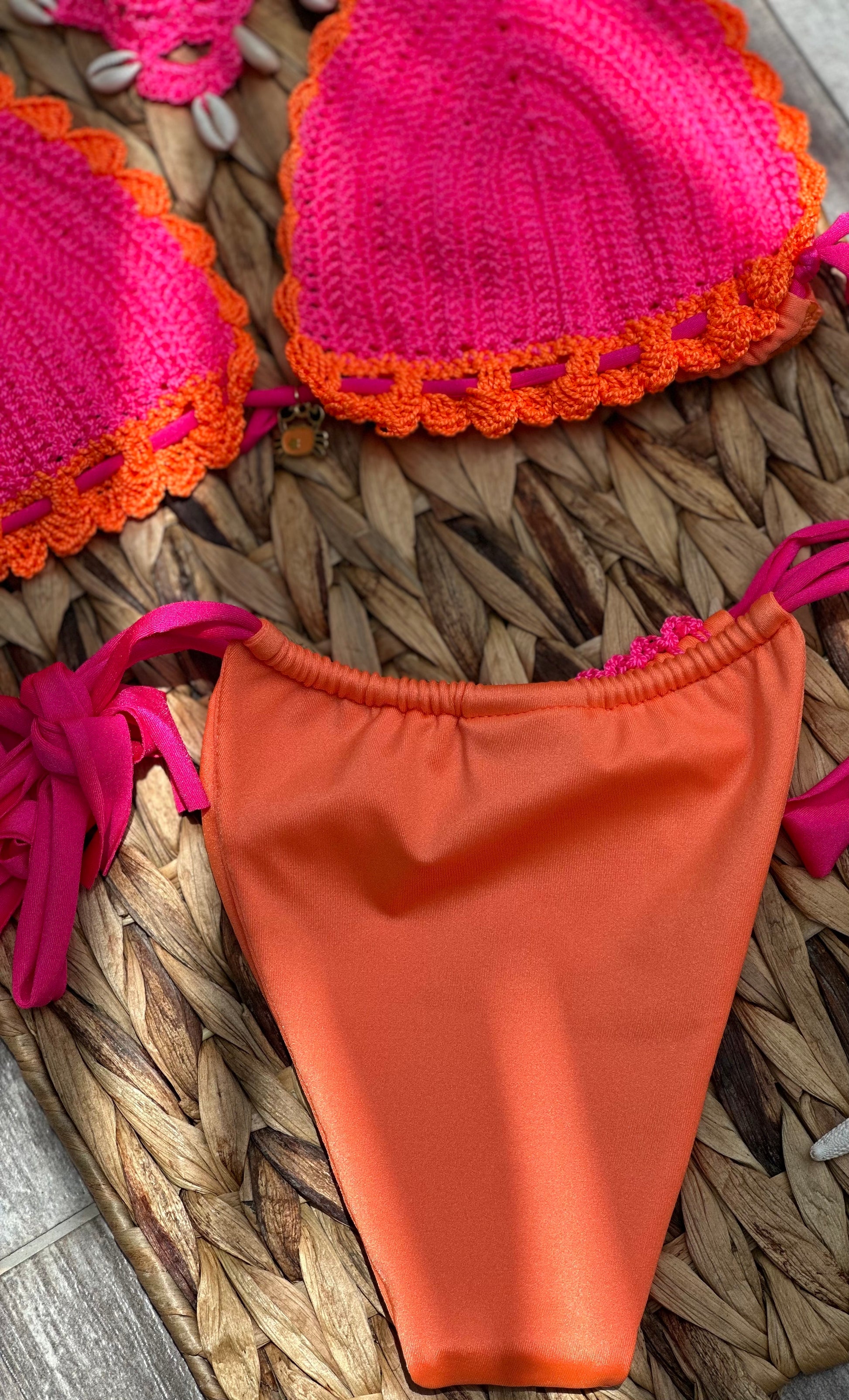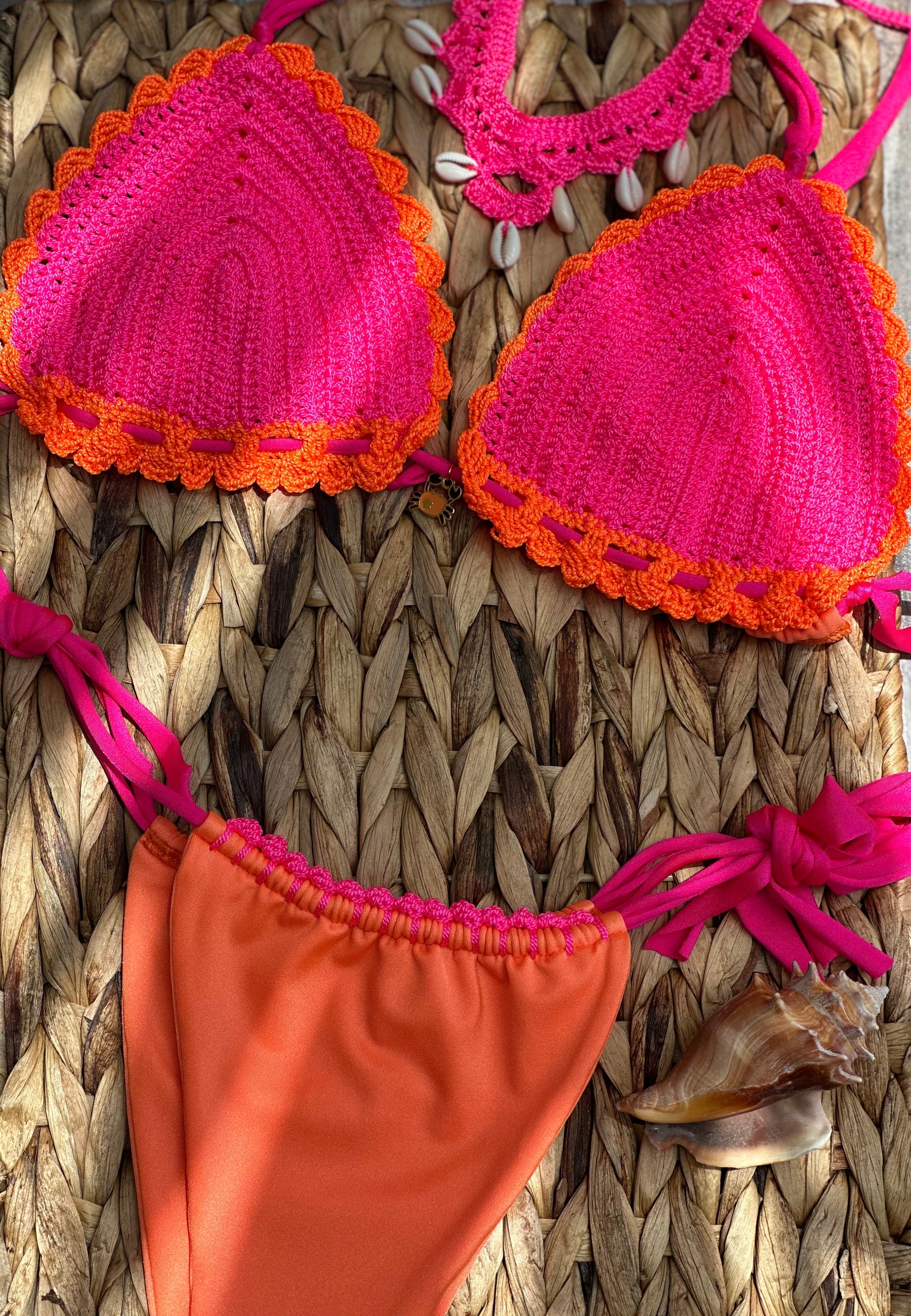 MODELO USA TALLA M. Bikini tejido en Crochet, 100% artesanal, incluye forro en la copa. chain contra aguan. Incluye collar tejido en macramé. Panty de amarrar, las tallas corren bien.