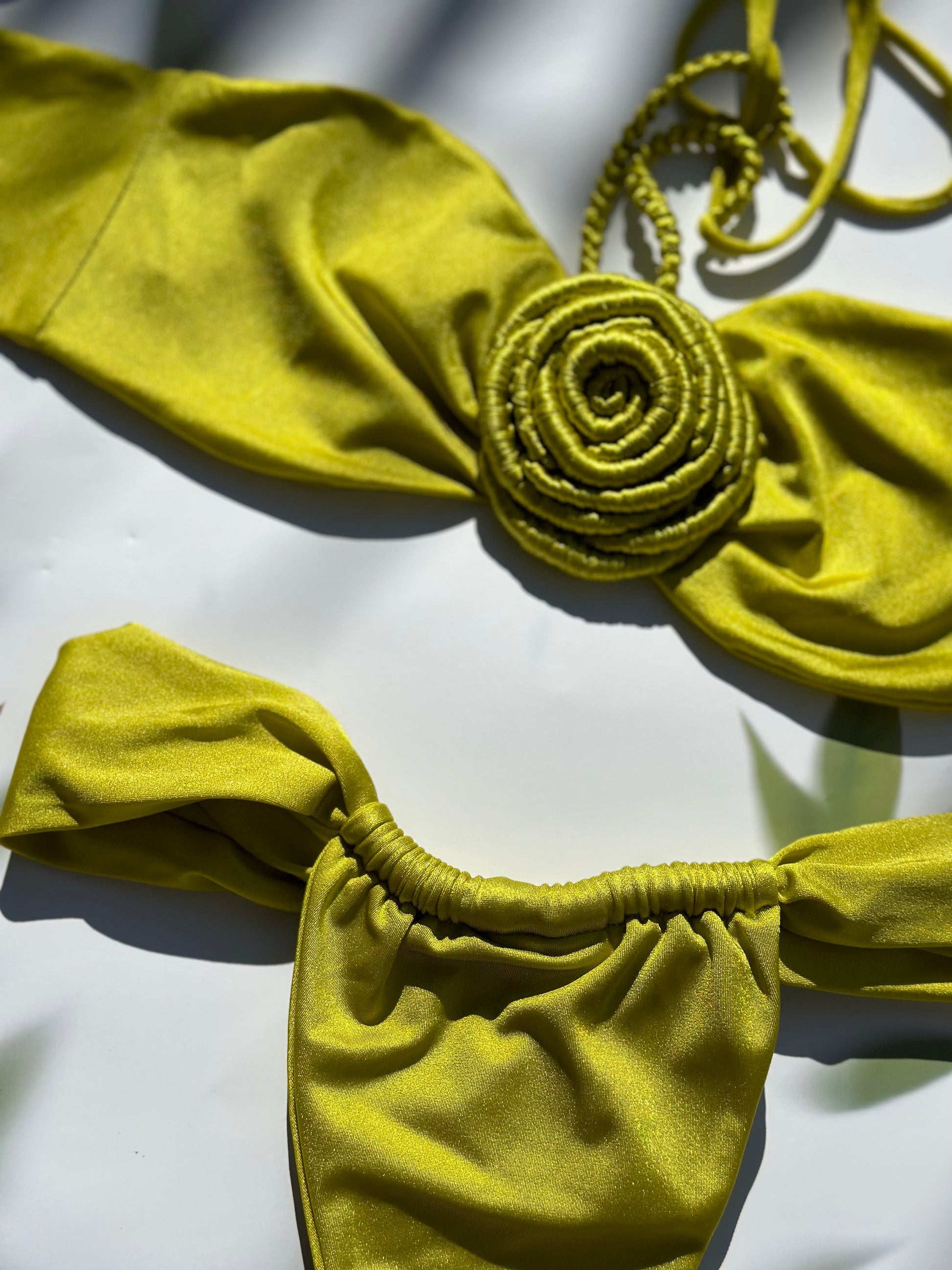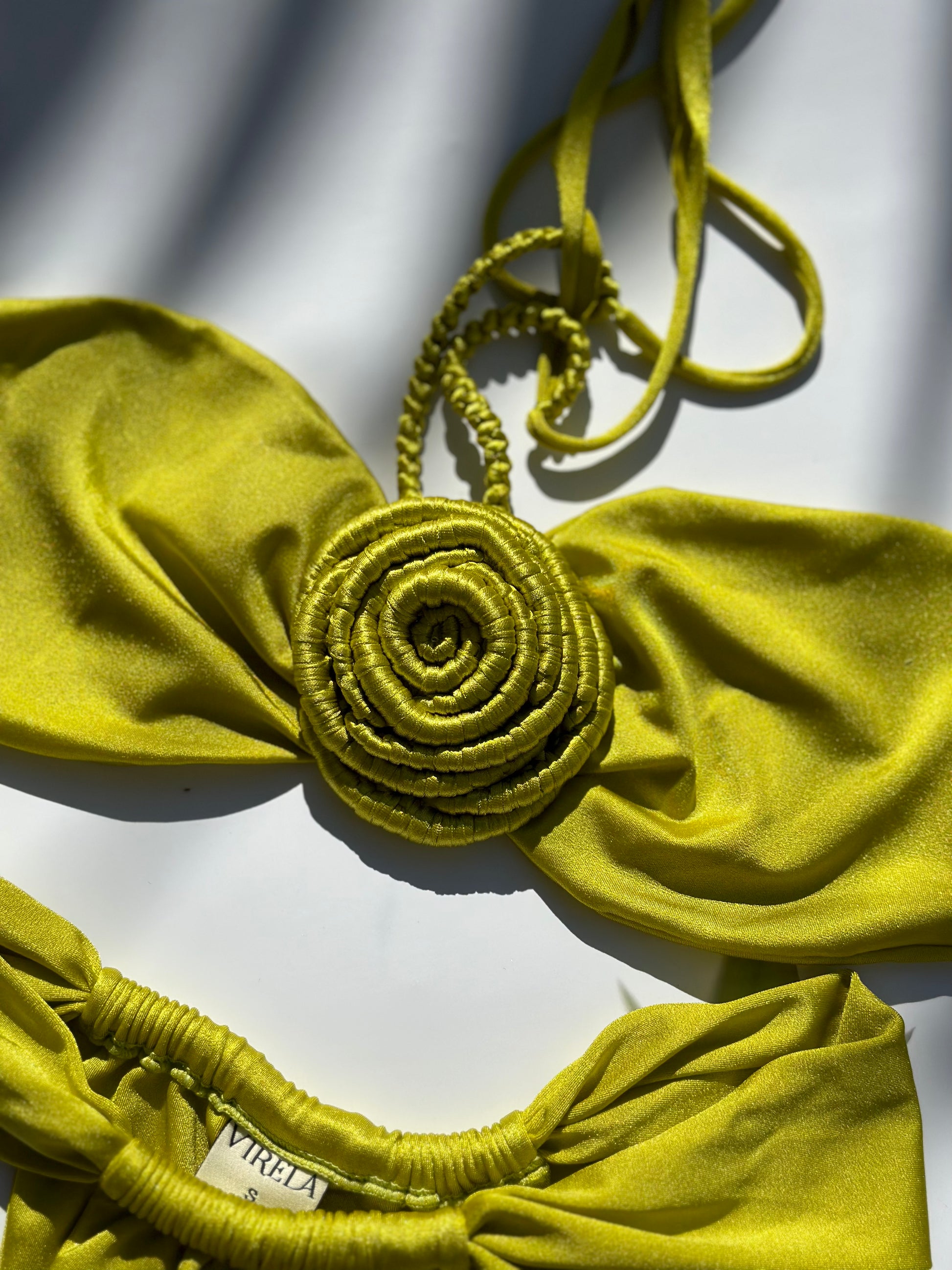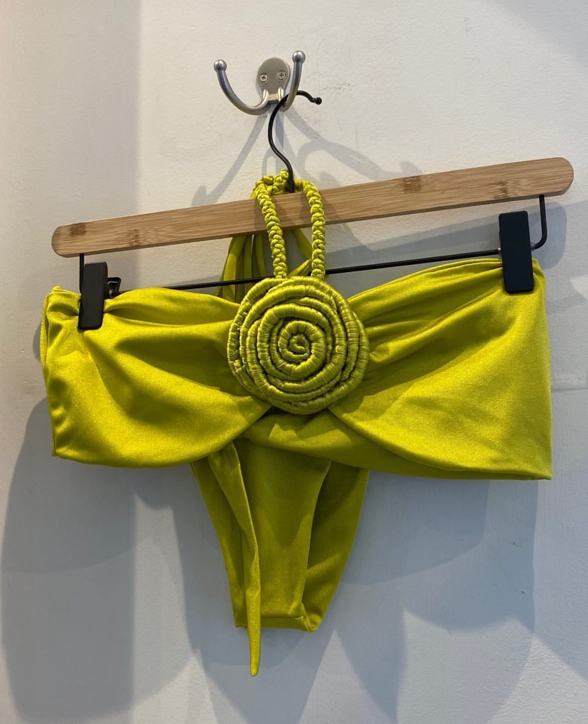 Strapless con amarre al cuello, flor tejida en macramé, tela de color en tendencia, las tallas corren normal. NO incluye copas.
