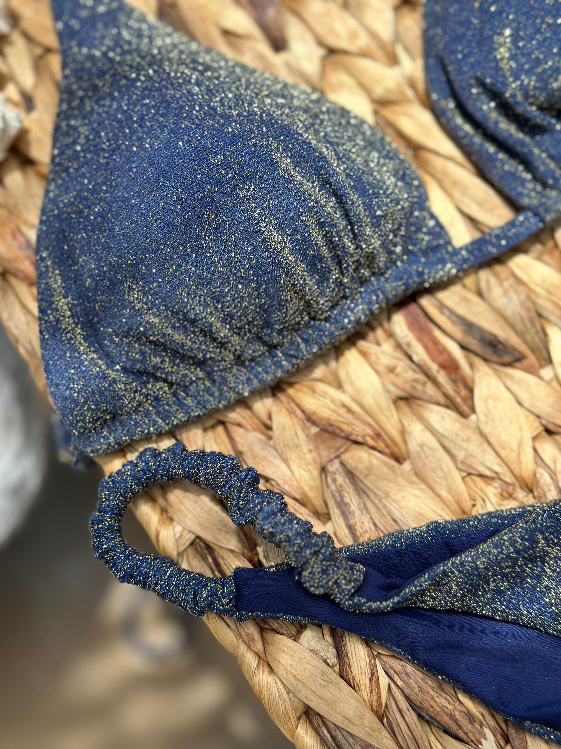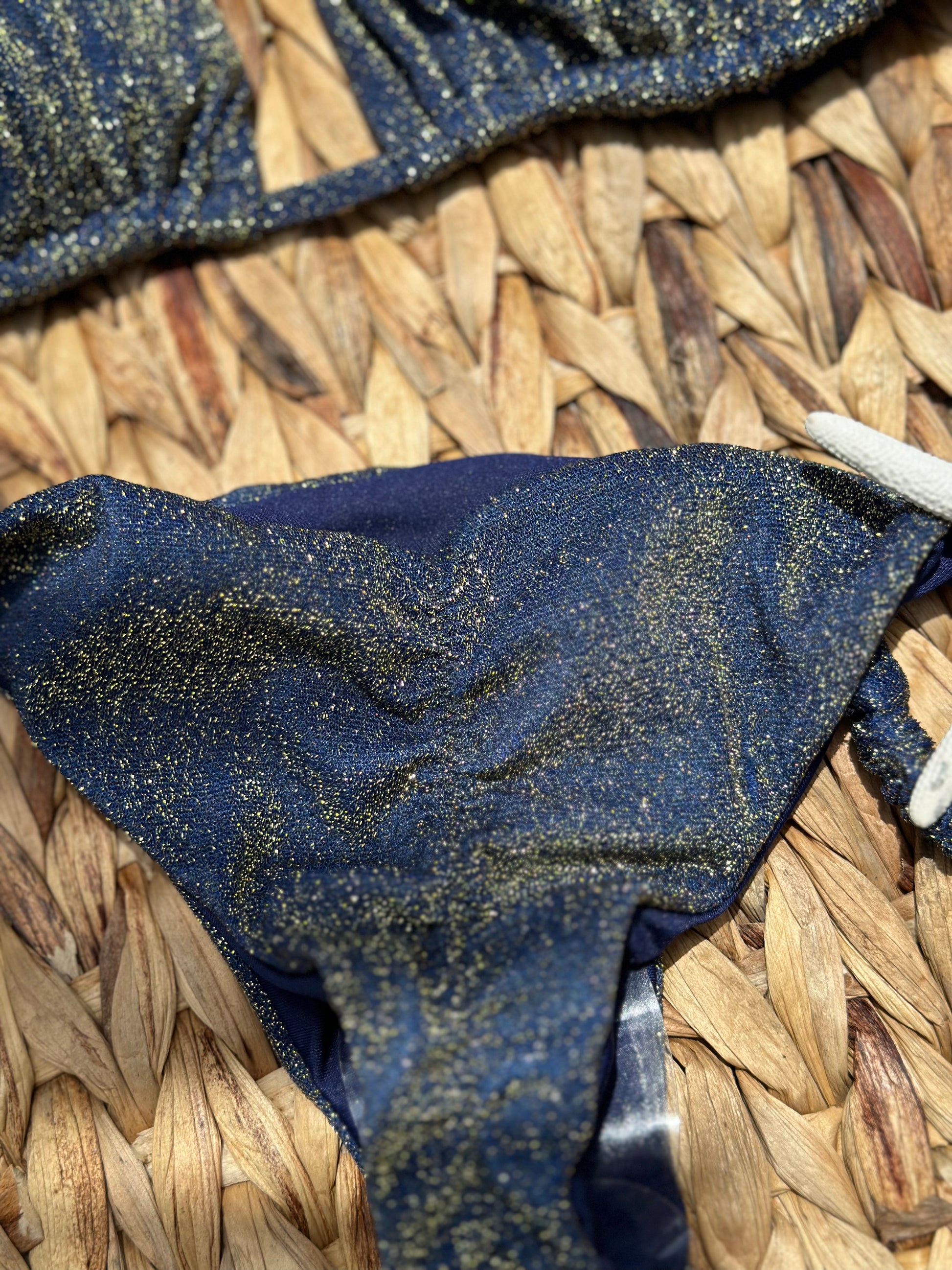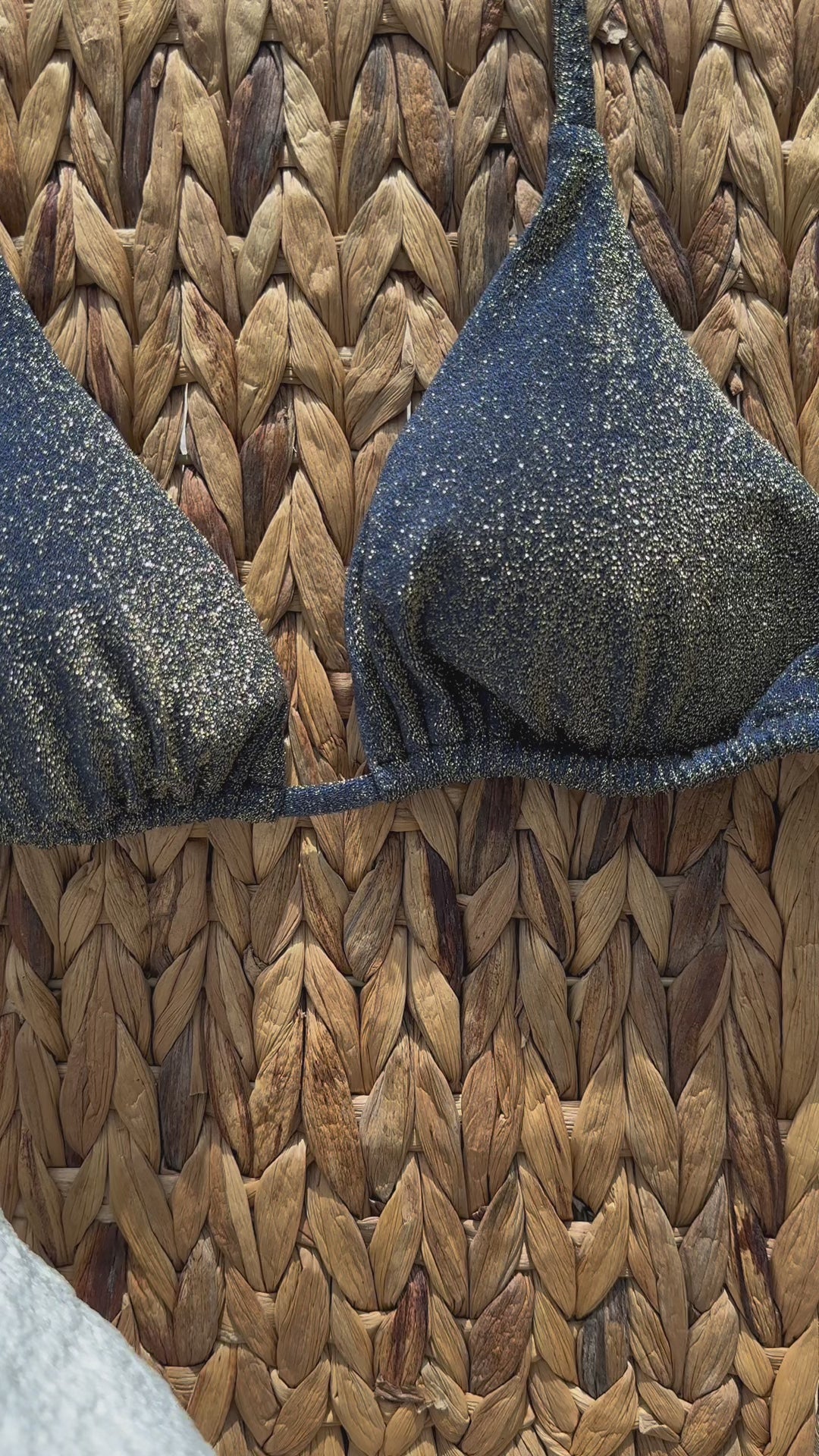 MODELO USA TALLA S. Triángulo con copas removibles, tirantes de graduar y ruches. Panty semibrasileño de ruches a los lados. Las tallas corren bien. Tela brillosa.