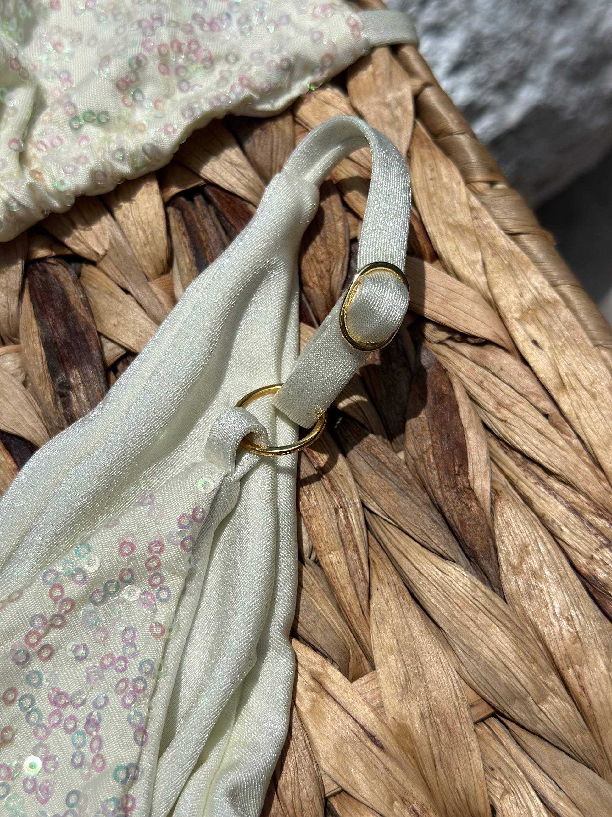Tela de lentejuela y NO pica. Aparte tiene para graduarle los tirantes